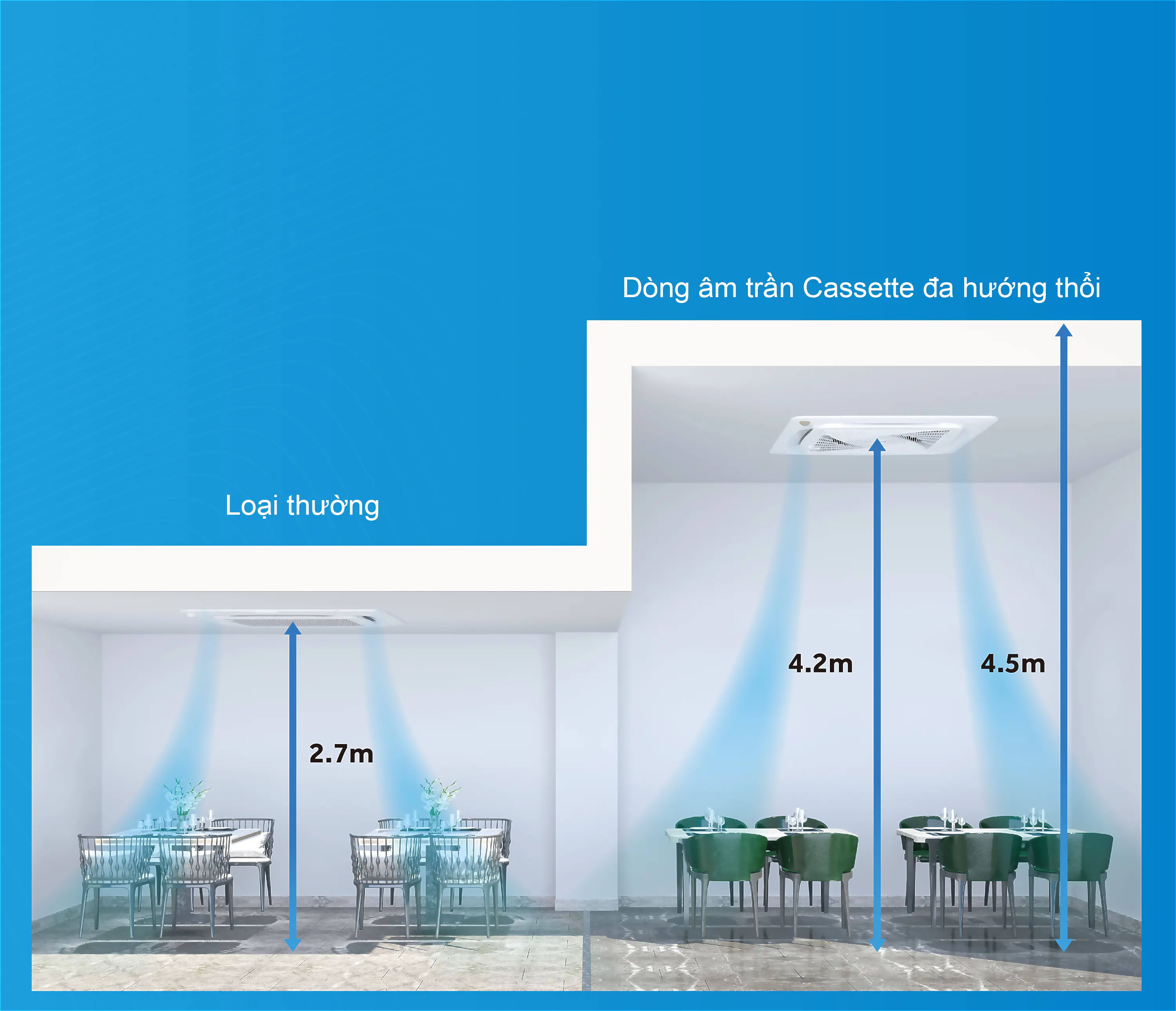 Có rất nhiều cửa hàng có trần cao 5 mét, điều hòa âm trần Aqua có thể được lắp đặt ở độ cao 4,5m. Giải pháp tốt nhất cho cửa hàng có trần cao, giúp cho khách hàng có thêm sự lựa chọn.